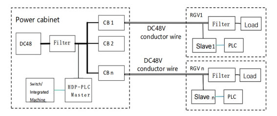 Broadband Power Line Communication (BPLC) uses the RGV's track cables as the transmission medium, providing high-speed, stable, and reliable real-time data transmission without the need for additional cabling and without being affected by external interference. A BPLC master device is installed in the power cabinet, and a BPLC slave device is installed on each RGV vehicle. By utilizing the existing physical hardwired connection of power lines, the system enables self-forming networks, data encryption, and bidirectional stable high-speed communication.